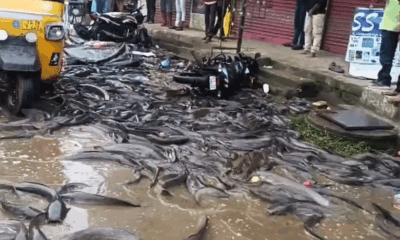 రోడ్డంతా చేపలే.. అవి కూడా సాదాసీదా చేపలు కాదండోయ్.. ఖరీదైన కొర్రమీను చేపలు. అందులోనూ లైవ్ ఫిష్. అమ్మటానికి ఎవ్వరూ లేరు.. కొనేవాడూ ఎవరూ లేరు.. దొరికొనోడికి దొరికినన్ని సంచిలో వేసుకుని వెళ్లిపోవటమే.. పులుసో ఫ్రై...